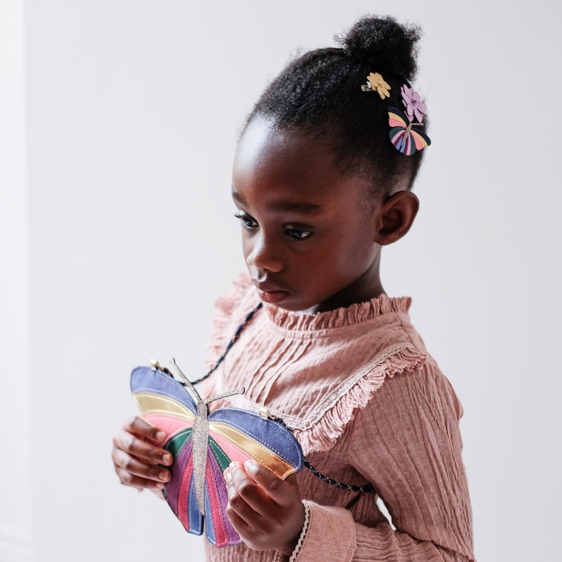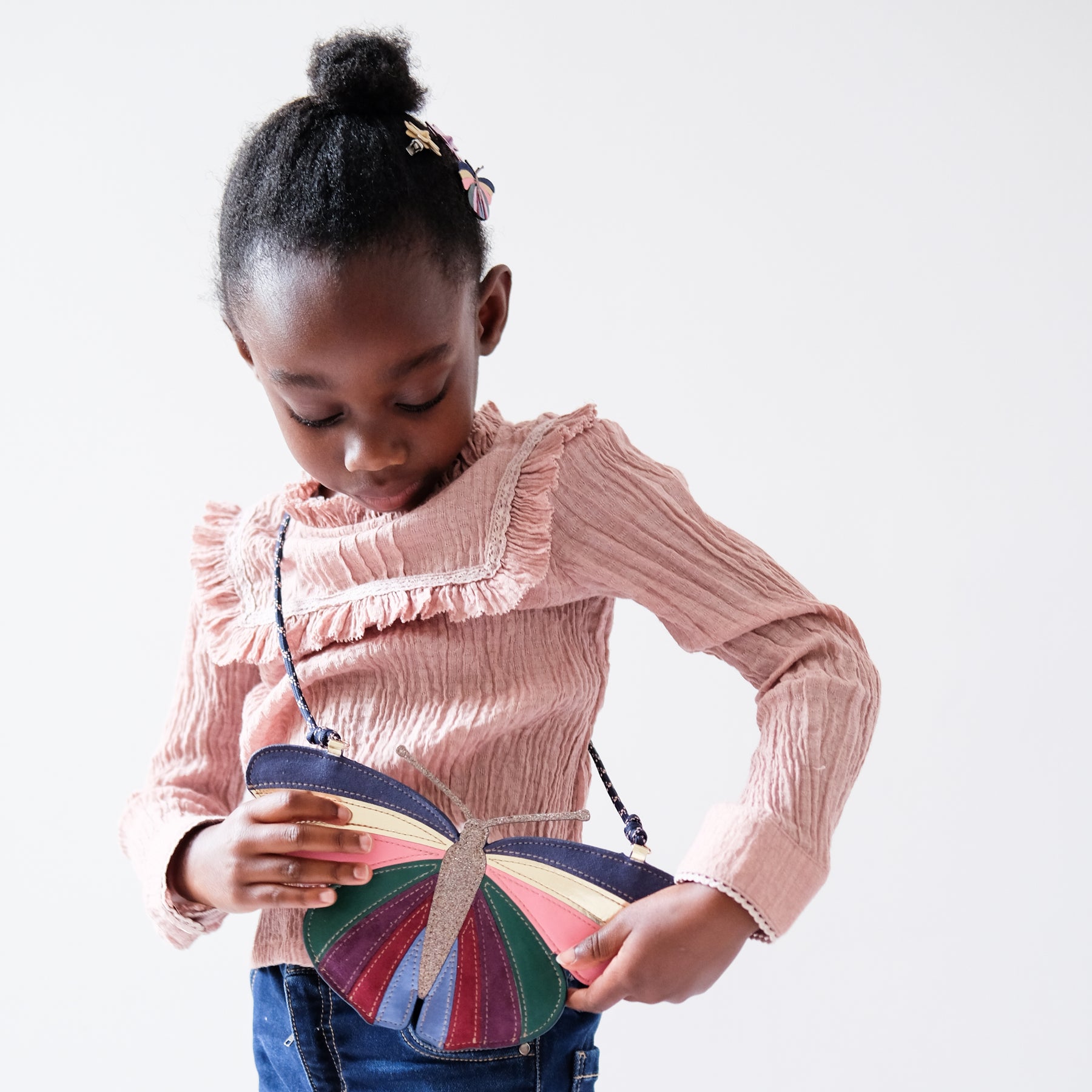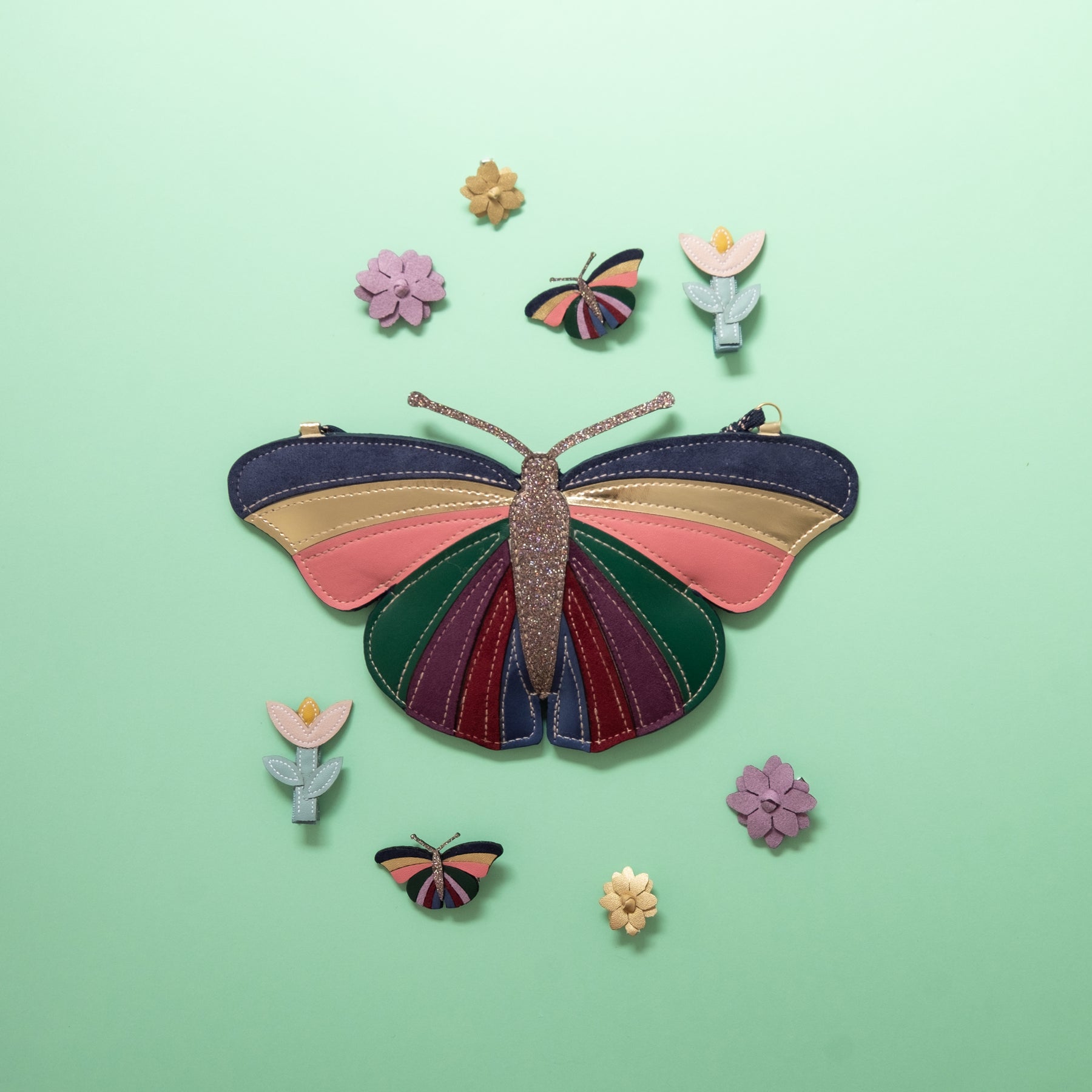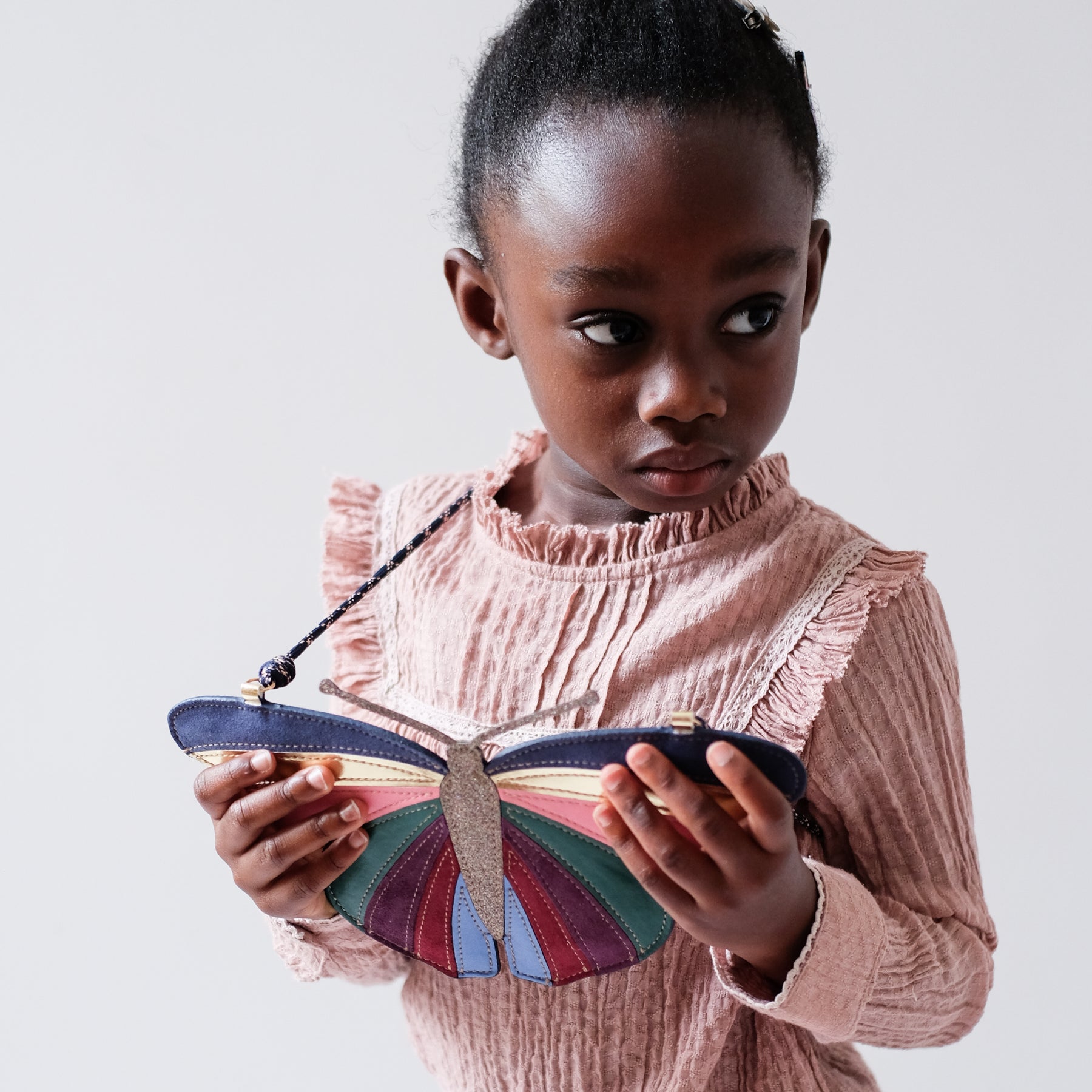 If your little one loves to chase the butterflies then what better gift than this autumn butterfly bag?! Made from a combination of soft leatherette and suedette fabric in a rainbow stripe of beautifully rich autumnal colours including forest green, blues, purple and burgundy with highlights or coral and gold. With a zip pocket and bungee cord cross body strap, this little bag will make a fluttery statement wherever she goes!