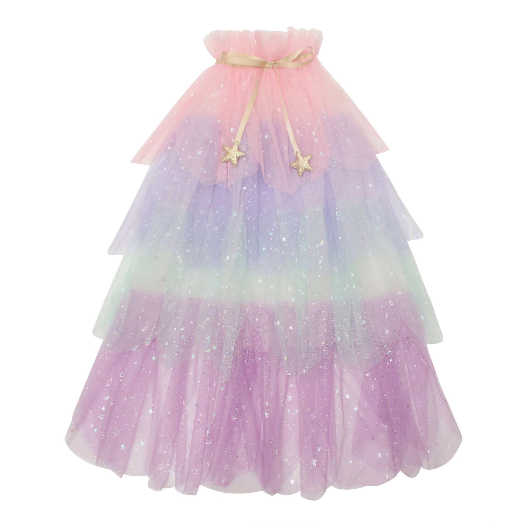 Pastel multicoloured layered dress up cape in glittery tulle fabric, with gold bow fastening and star decorations