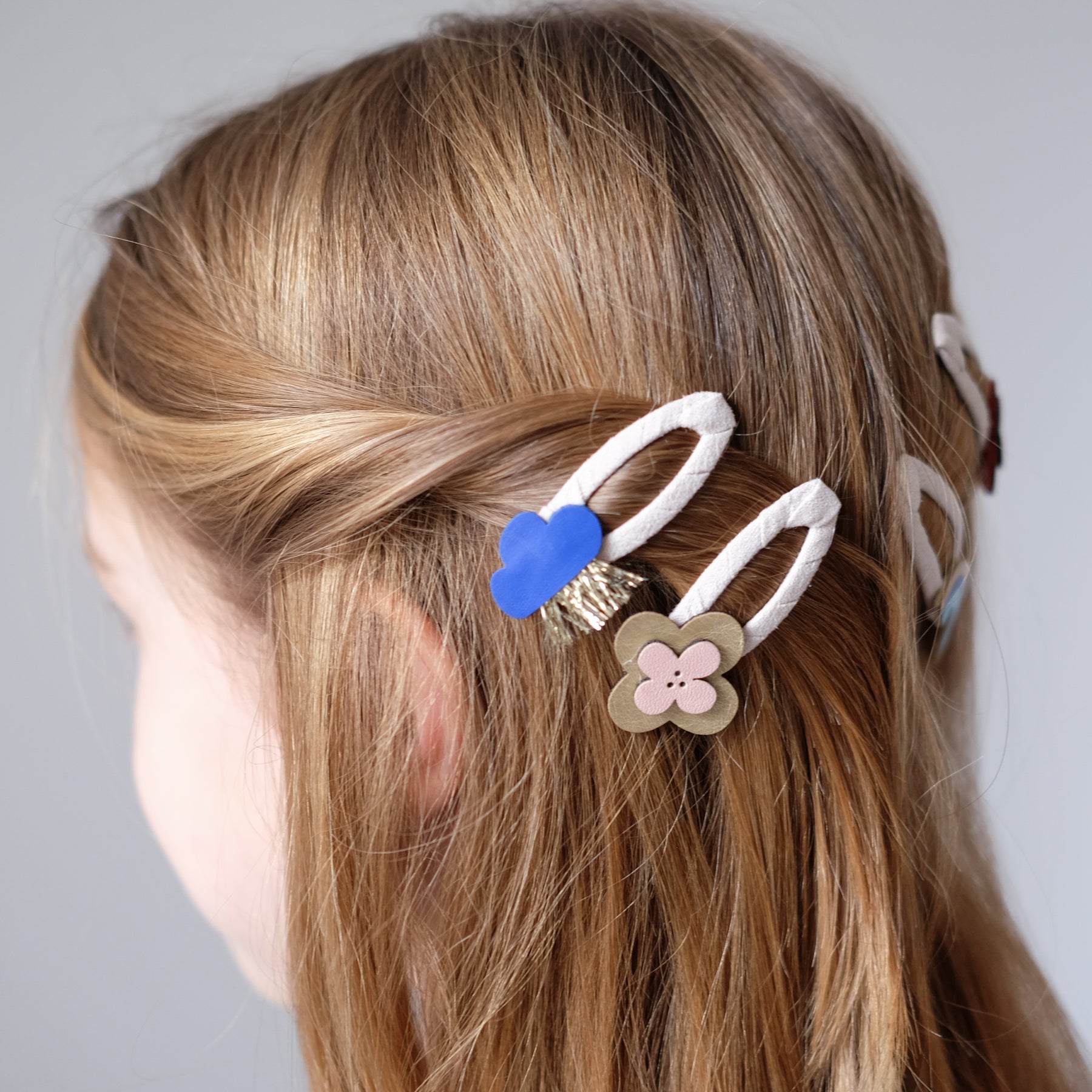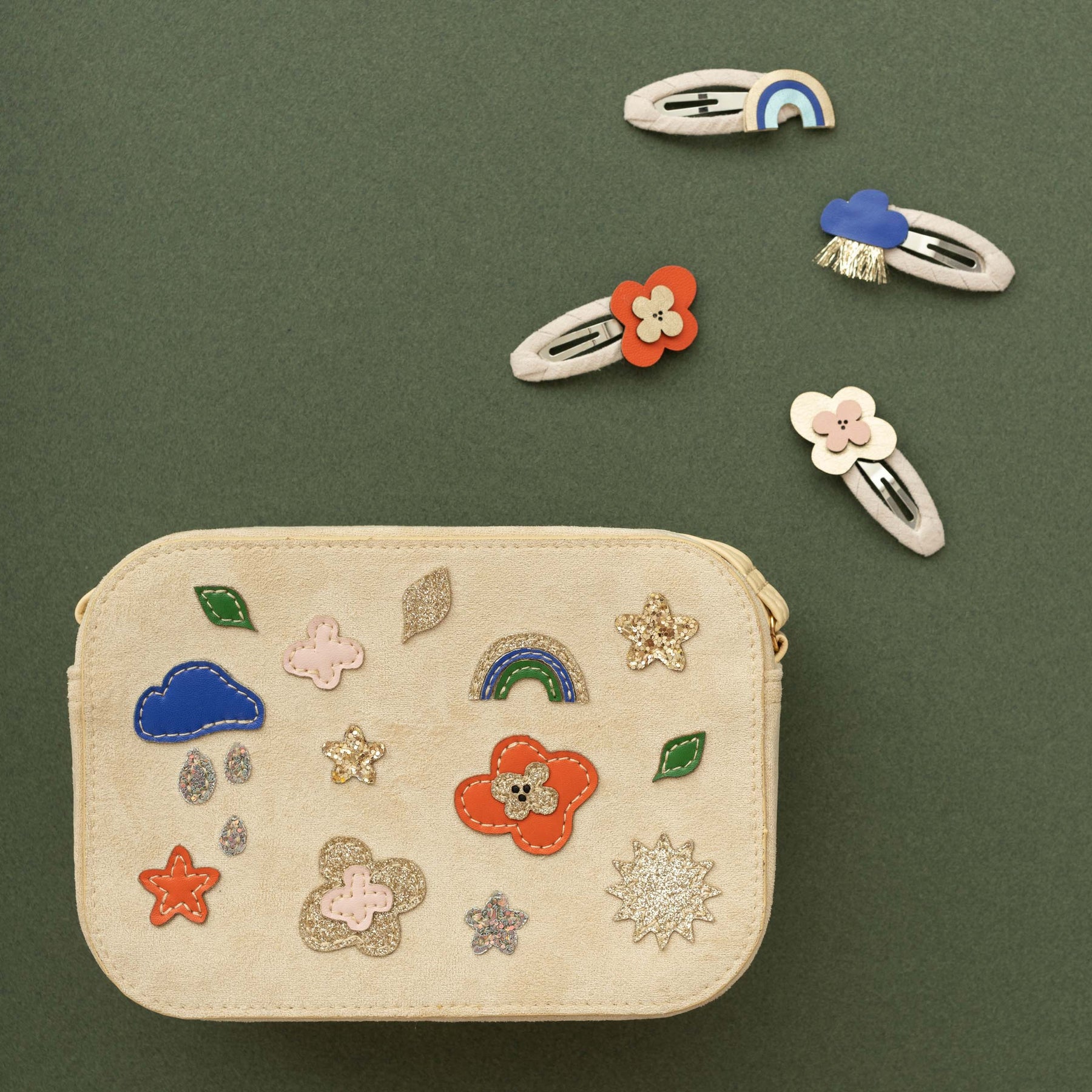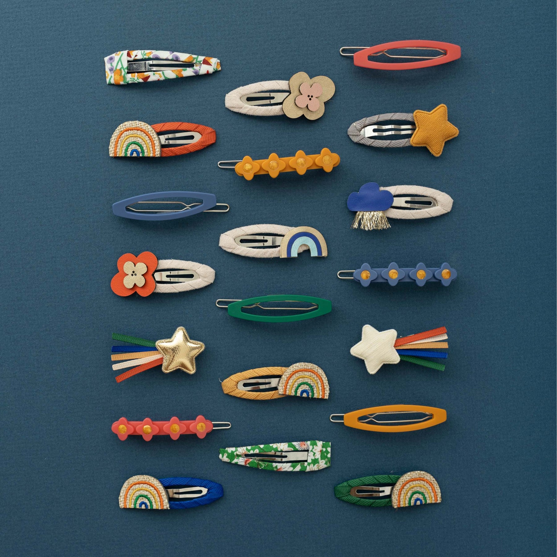 Everywhere you go, always take the weather with you! This gorgeous little pack of weather-inspired clic clacs make the perfect clips for summer hair! Soft and neutral suedette fabric wrapped clic clacs perfectly topped with either a raincloud, flower or rainbow in bright and colourful leatherette fabrics. These adorable clips are super strong meaning they will stay in place all day and are perfect for adding a fresh pop of colour to any outfit!