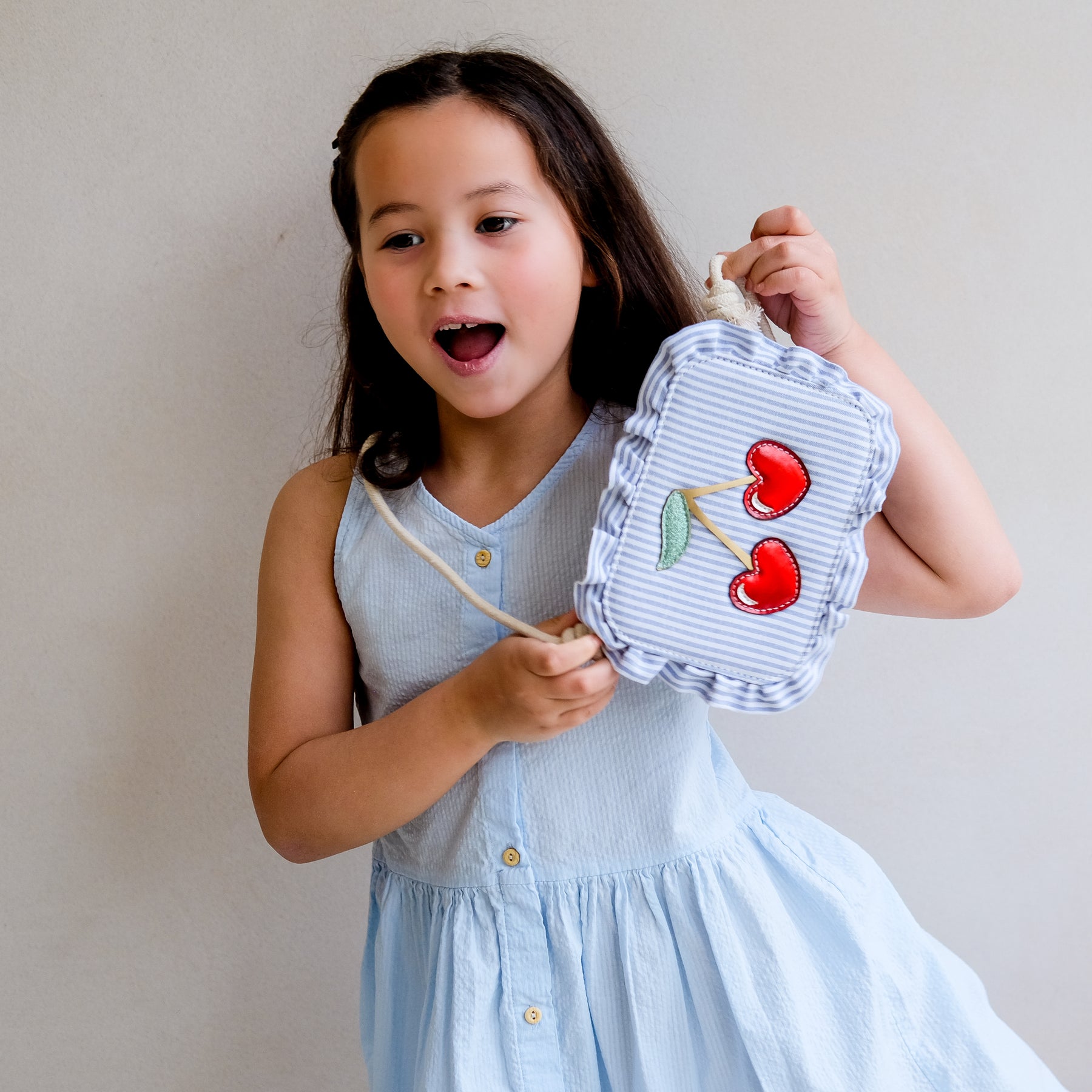 Our Striped Cherry Bag is as delightful as it is practical! Featuring pale blue stripes, ruffled edges, and a standout pair of metallic red cherries - perfect for little fashionistas on the go!
