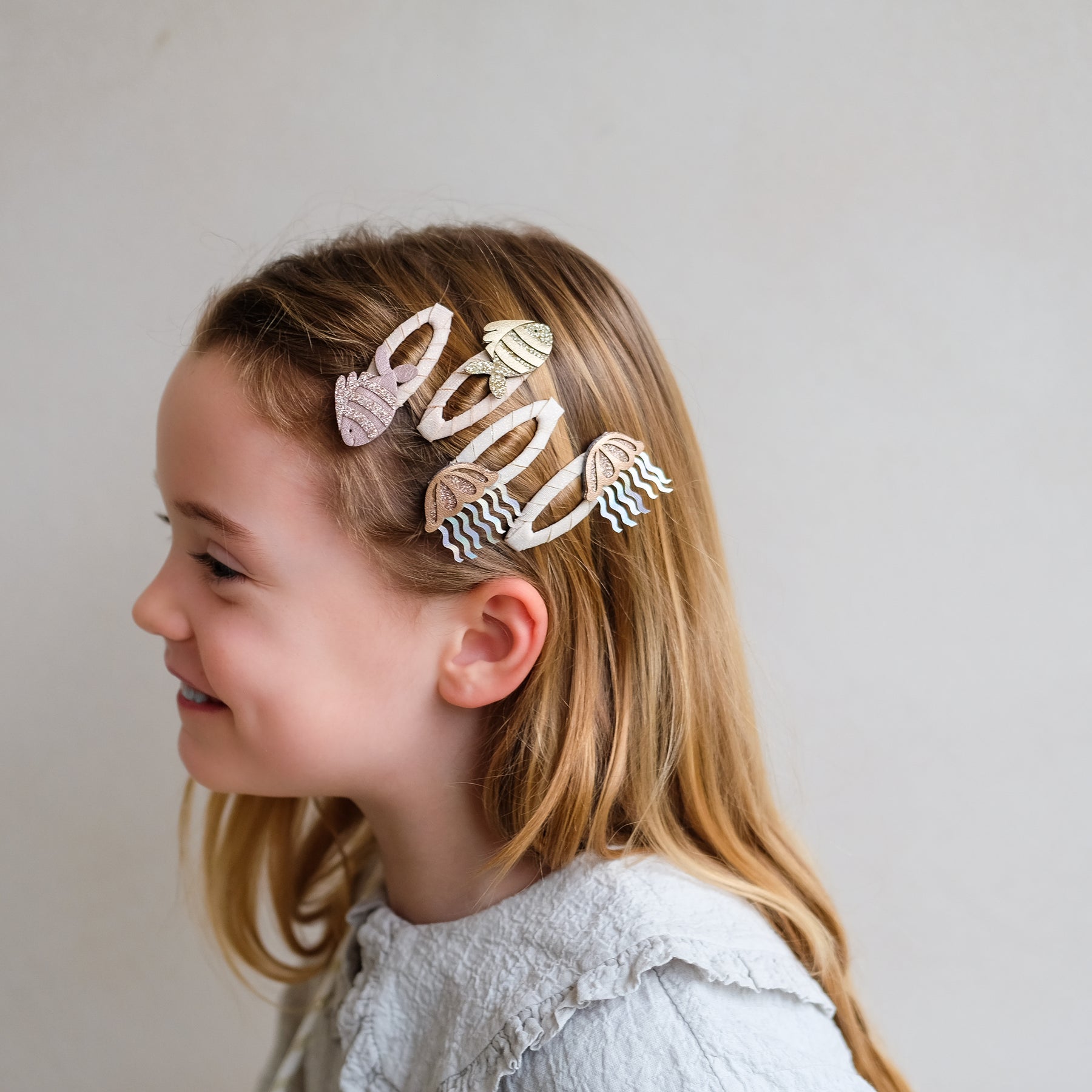 This sweet little clip set features two shimmering jellyfish and two glittery striped fish all in soft pink and sparkly tones. A fin-tastic way to add a splash of ocean charm to any look!