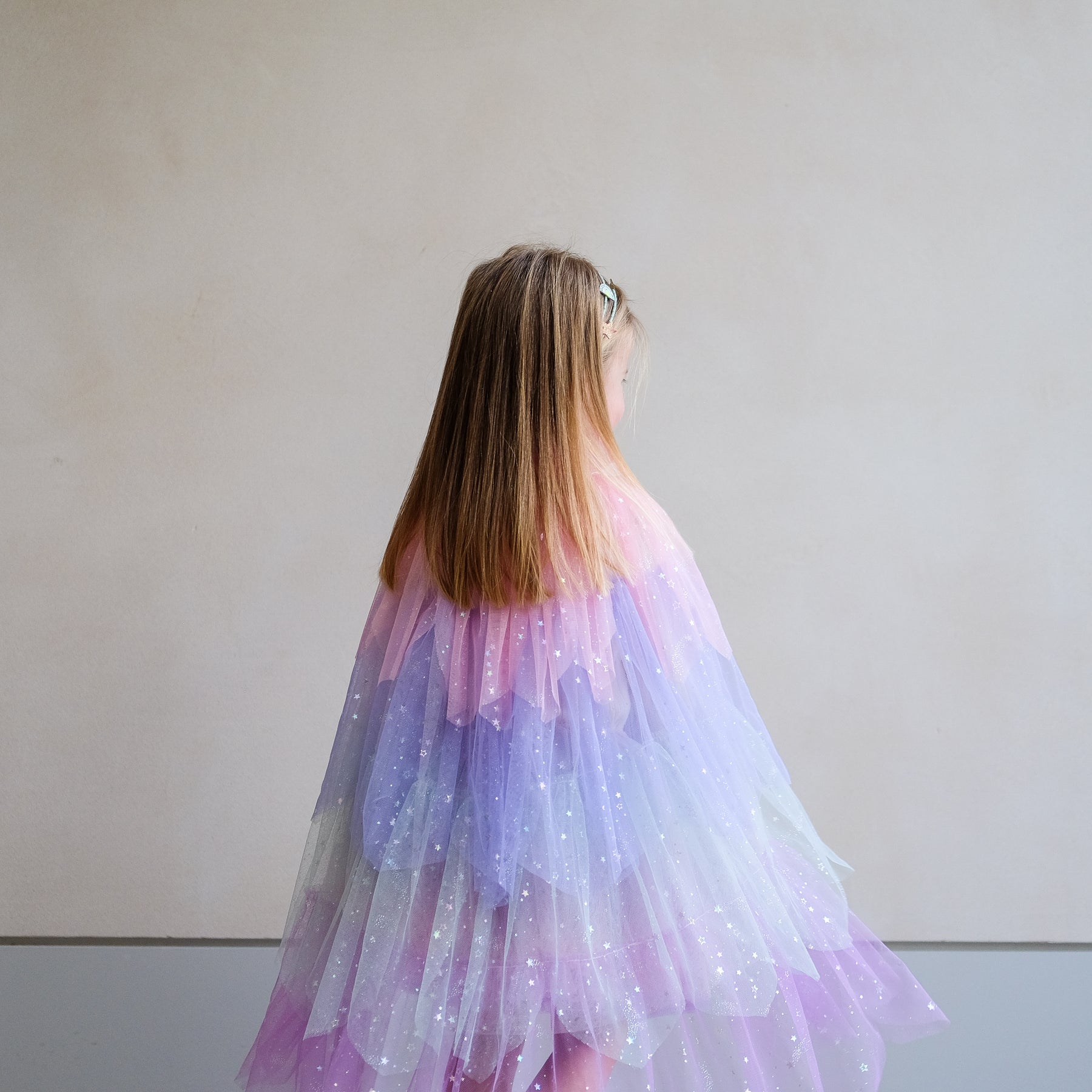 Young girl wearing a sparkling pastel cape against a purple background