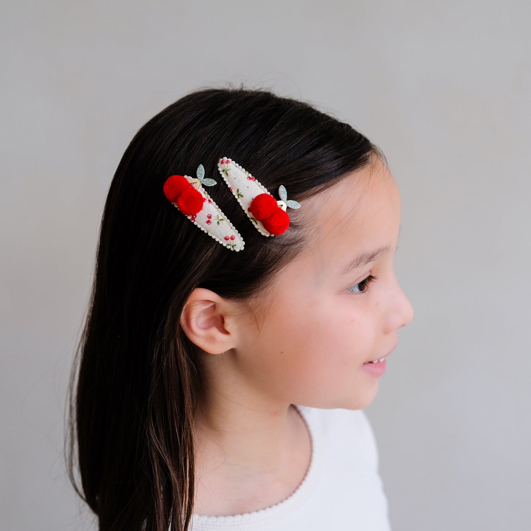 Add a fun and fruity twist to their hair with these adorable cherry clips, each topped with a pair of super soft, bright red pom pom cherries for a bright pop of cheerful charm!