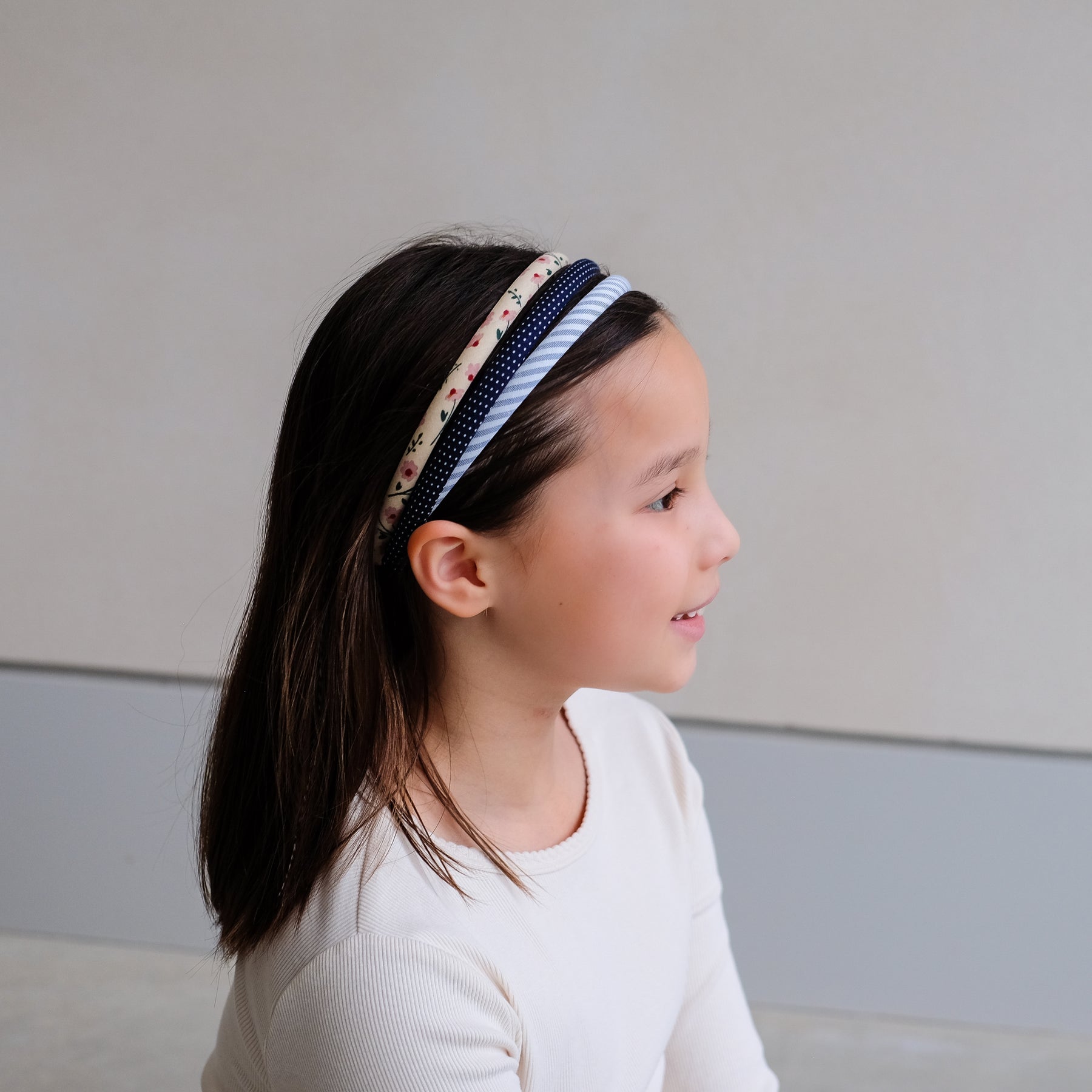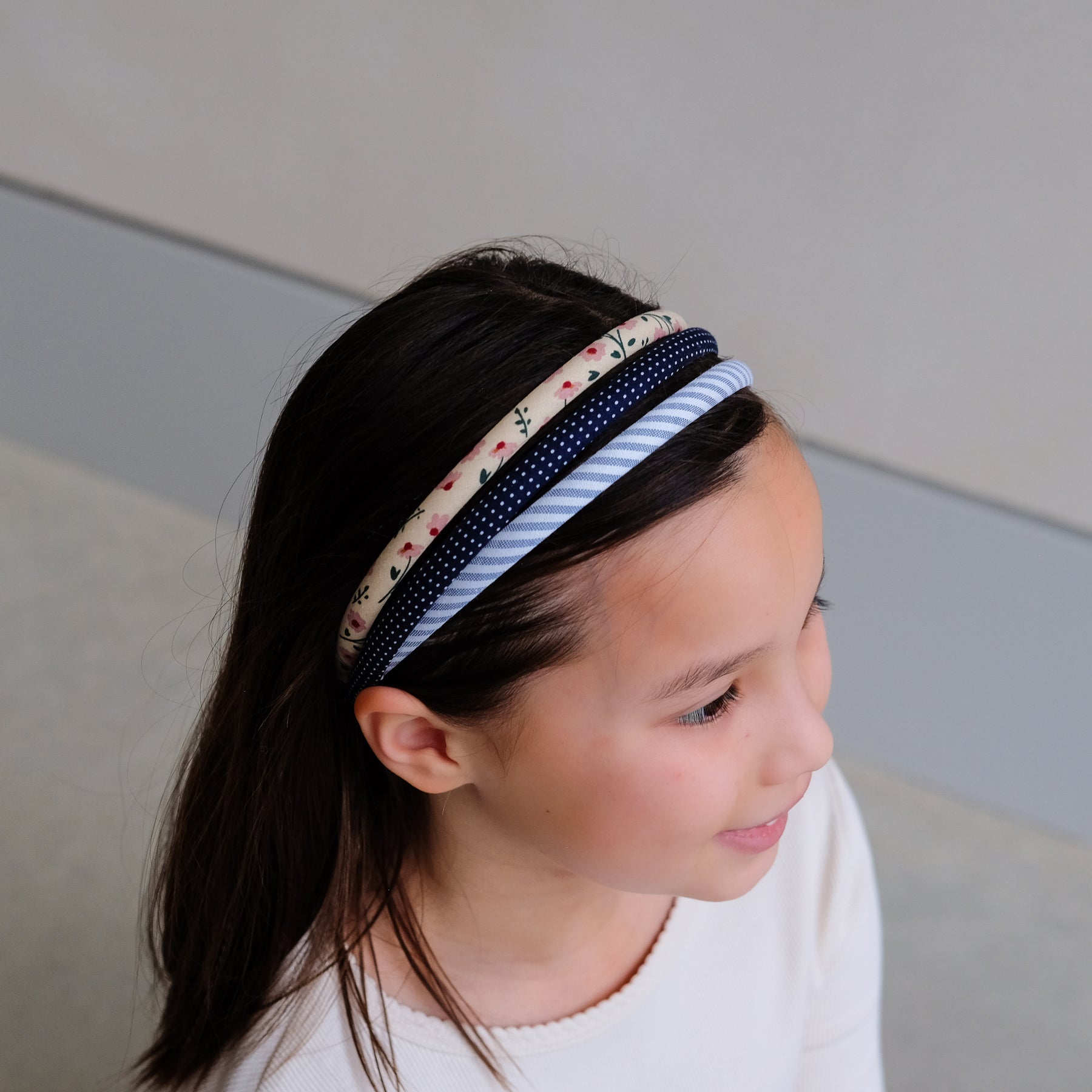 A girl wearing a set of 3 printed fabric wrapped Alice head bands