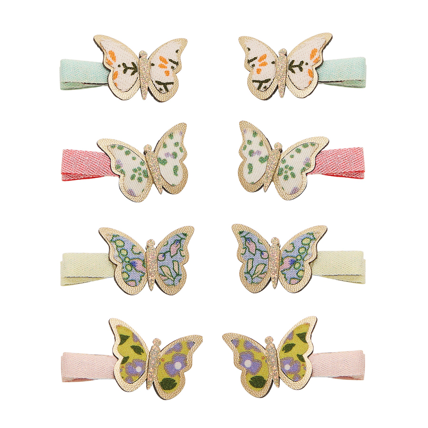 Add a flutter of fun with our Floral butterfly mini clips! Each dainty gold-edged butterfly is perched atop a contrasting colourful clip, perfect for tiny tresses and big adventures!