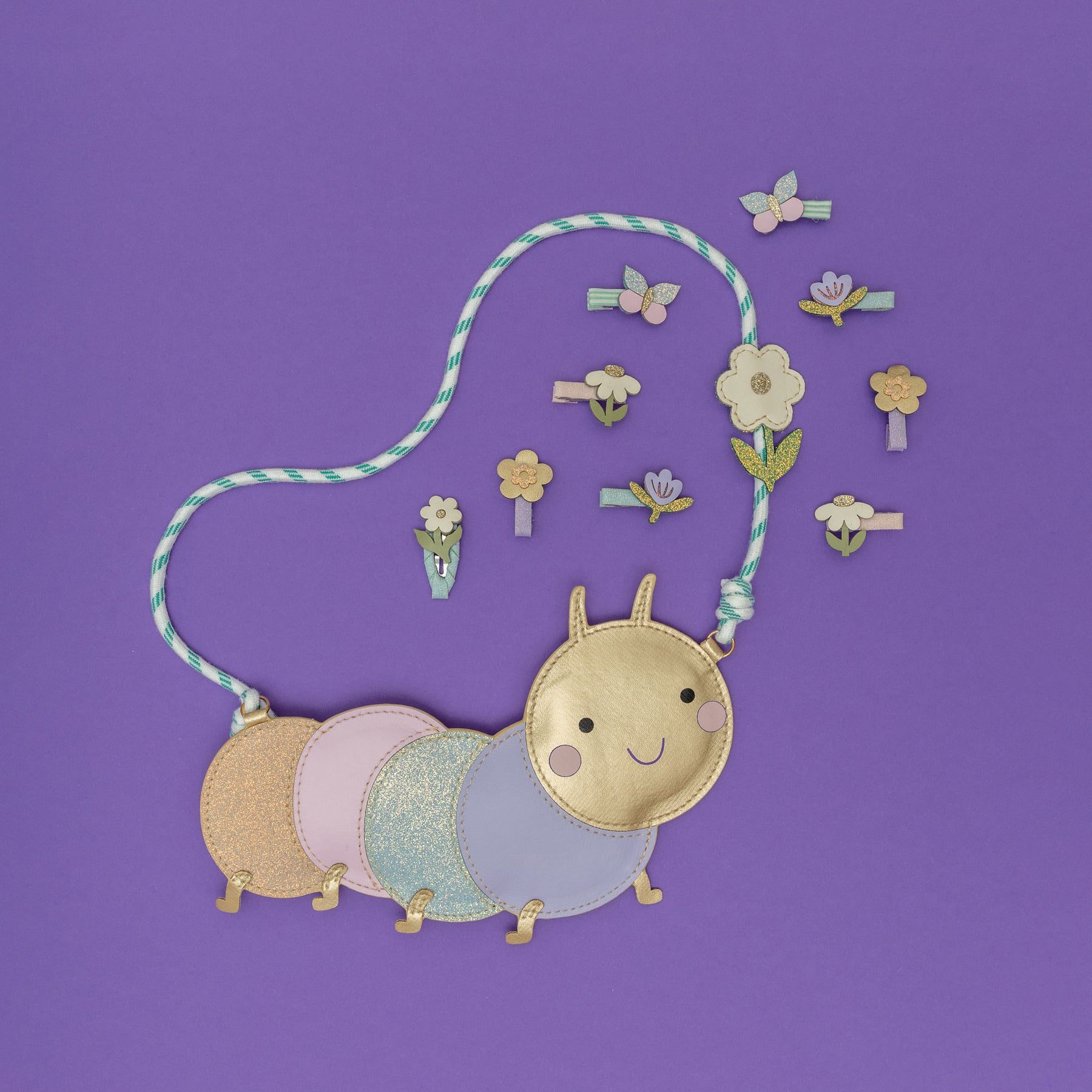 Mimi and Lula's super cute Hungry caterpillar bag is ready to wiggle into your heart! Crafted from dreamy pastel shades with a good sprinkling of glitter - it's the perfect companion for creepy crawly fans!