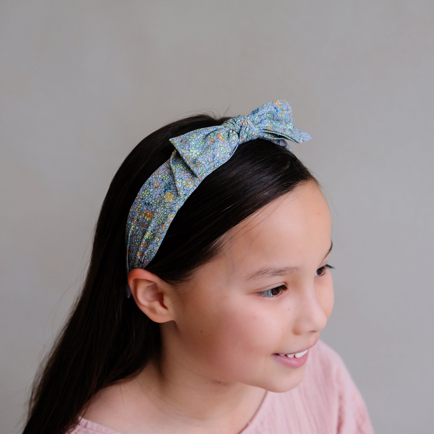 A girl wearing a hair band made from floral fabric with a bow feature in a blue colour scheme
