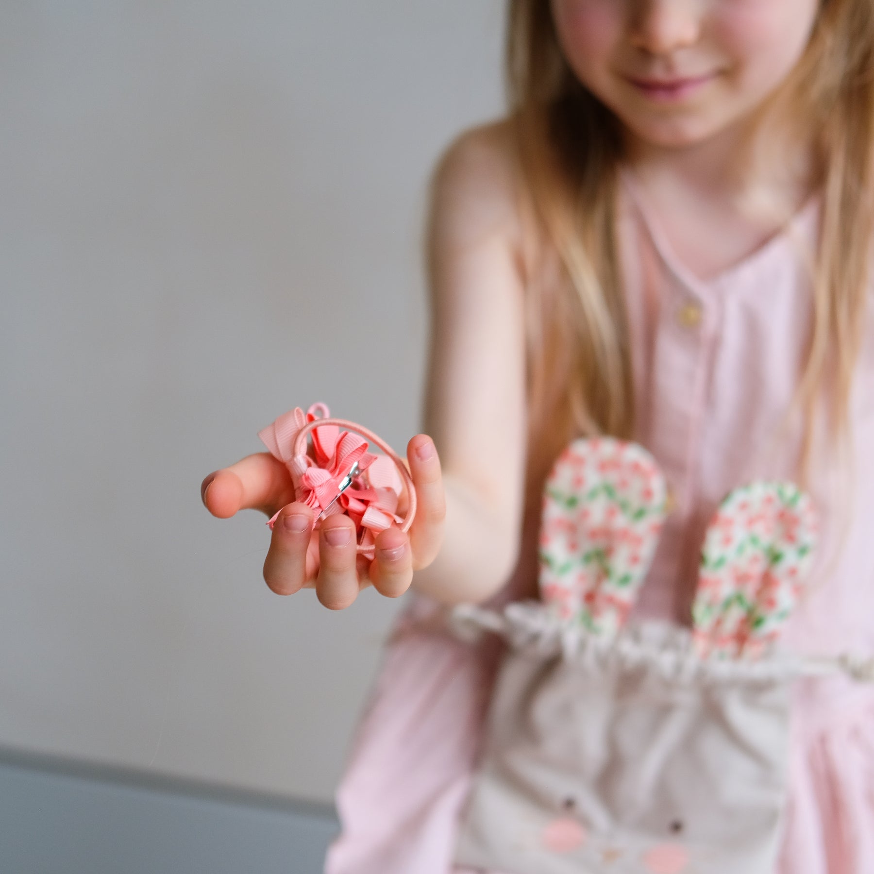A girl holding a collection of pink Easter themed hair accessories including clips and hair bands